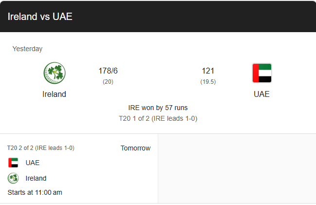 The second T20 of the series is scheduled for tomorrow, with the match set to begin at 11:00 am. UAE will be eager to bounce back and level the series, while Ireland will look to continue their dominance and secure a series clean sweep.