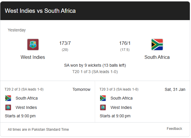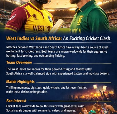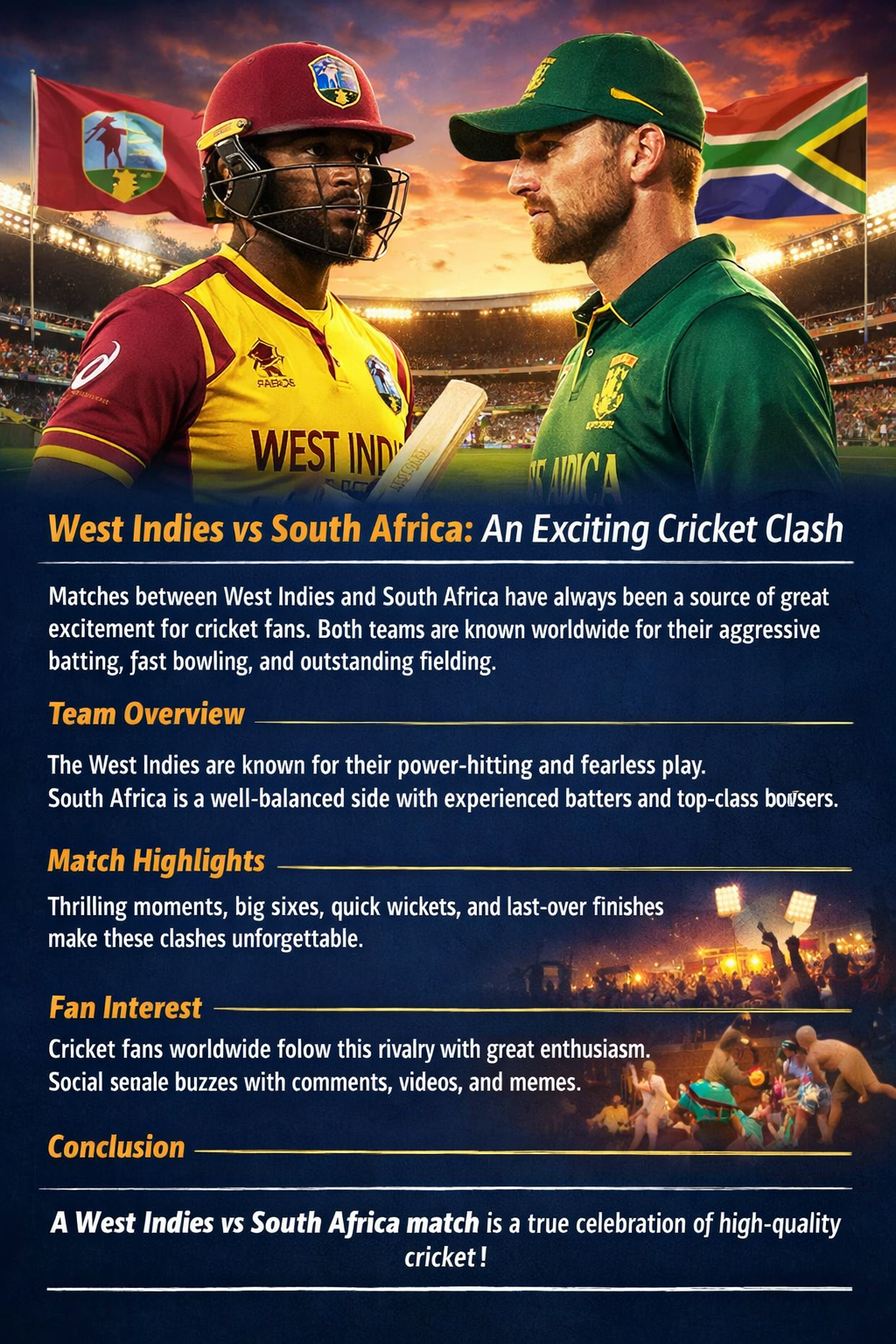 Experience the excitement as West Indies and South Africa face off in a thrilling cricket match. Witness power hitting, disciplined bowling, and strong competitive spirit from both teams, showcasing standout performances that kept fans on the edge of their seats. West Indies vs South Africa,